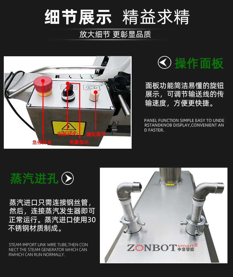 - 日常維護(hù):每天使用完畢后,應(yīng)清理設(shè)備表面的灰塵和雜物,擦拭干凈輸送帶和蒸汽噴管;檢查水位,及時補充軟化水,確保蒸汽發(fā)生器正常工作;檢查各部件的連接是否牢固,有無松動、泄漏等情況。