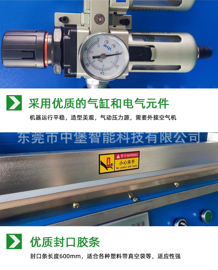 - 封口原理:抽氣達到設定時間后,與上封口條相連的氣囊在內(nèi)外壓差作用下膨脹,上封口條壓住袋口并通電加熱,使塑料薄膜融化并粘合在一起,完成封口操作,從而保證包裝袋內(nèi)的真空狀態(tài)得以維持。