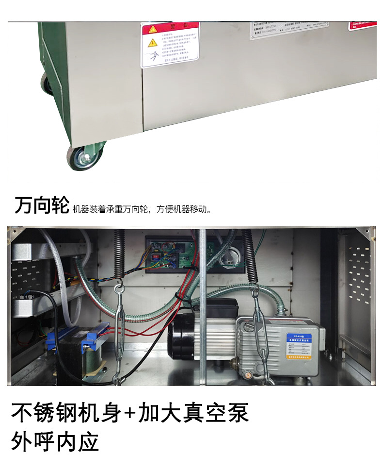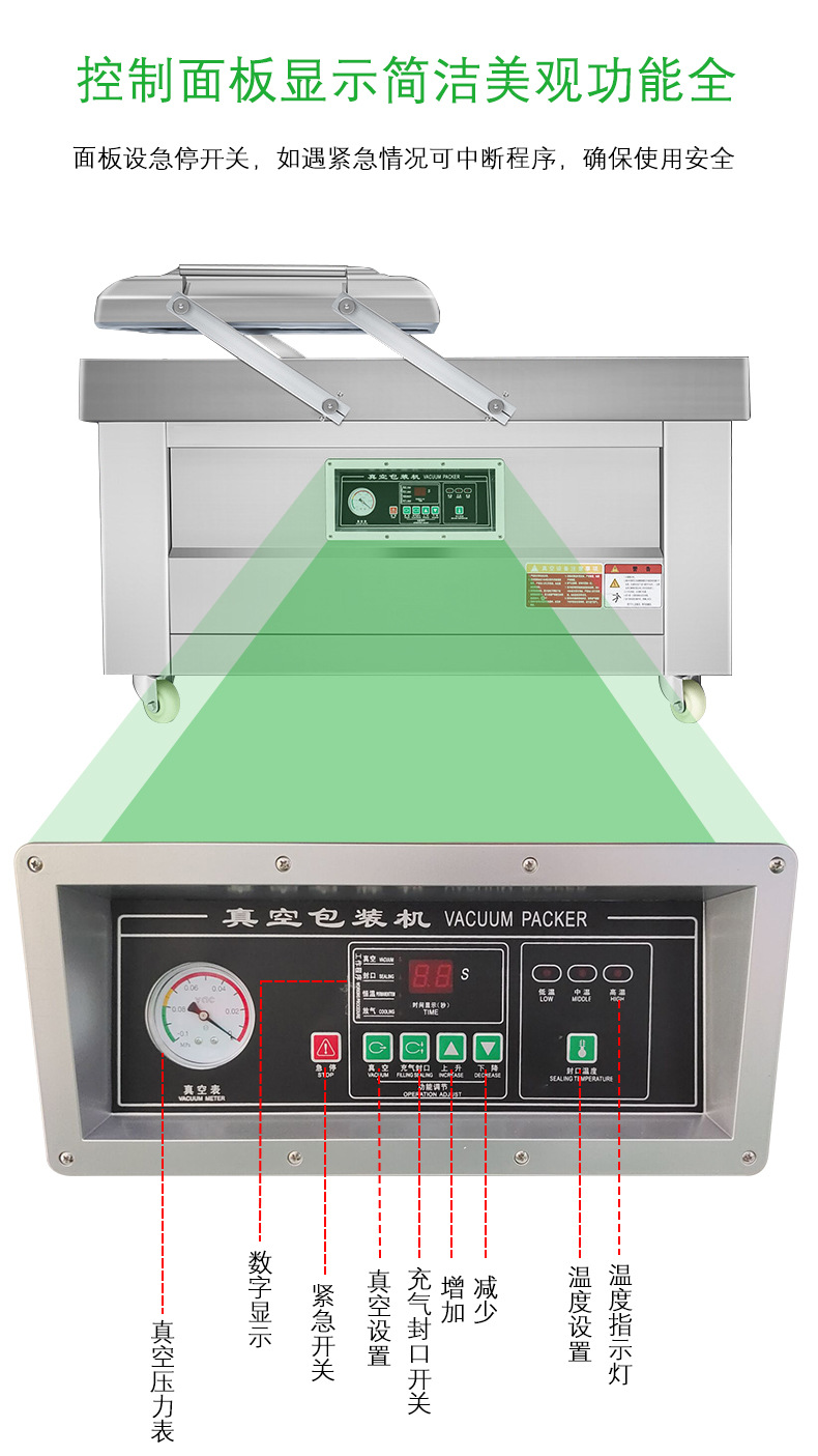 - 抽真空:壓下機蓋,面板上抽氣(真空)指示燈亮,真空泵開始抽氣,可通過抽真空旋鈕根據(jù)包裝要求調(diào)節(jié)真空度高低。