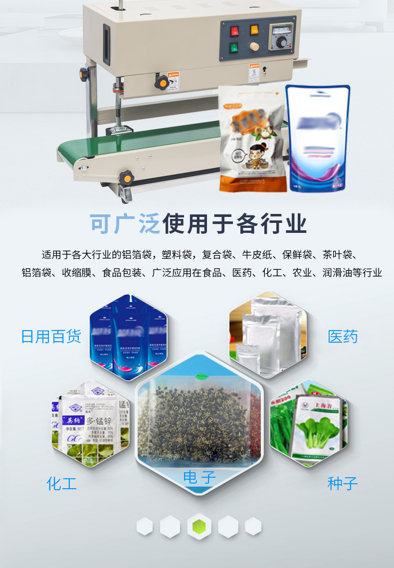 - 食品包裝行業(yè):用于各類食品的包裝袋封口,如肉類、熟食、堅果等。